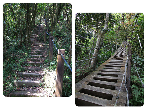 上圖右側的枕木梯圖,往獅子頭山上爬去的途中共有三座, 近似九十度垂直的攀登路線(比照片上看起來的還要更陡), 原本在觀獅坪由下往上望去,還在考慮要不要往上爬... 因為在下面看到山上的人影,只有一丁點的大小...